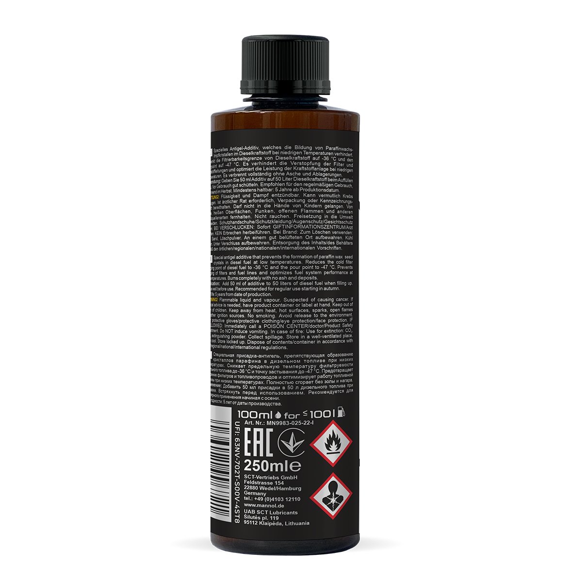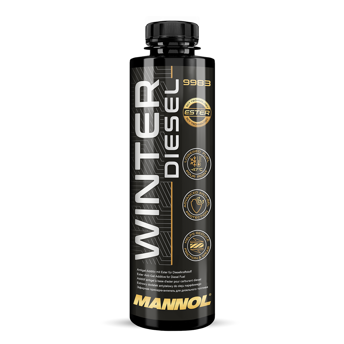 MANNOL Winter Diesel – a special anti-gel additive developed using a unique technology to reduce the pour point (gelation) and the maximum filterability temperature of both summer and winter diesel fuel grades. It is suitable for any type of diesel fuel and all types of diesel engines (atmospheric and turbocharged) with any fuel systems, equipped and not equipped with diesel particulate filters and catalysts. It does not change the basic properties of the fuel, only improves its low-temperature characteristics.