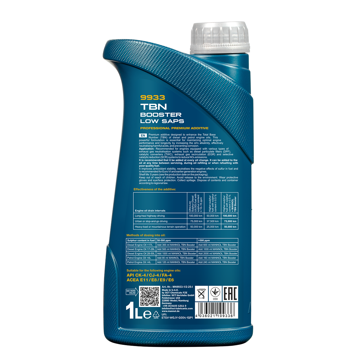MANNOL TBN Booster Low SAPS improves antioxidant stability, neutralises the negative effects of sulphur in fuel and is recommended for Euro VI and earlier generation engines.