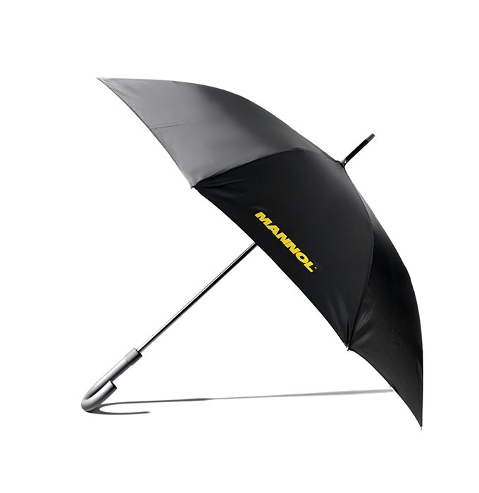 Automatic windproof straight handle black umbrella with MANNOL logos.