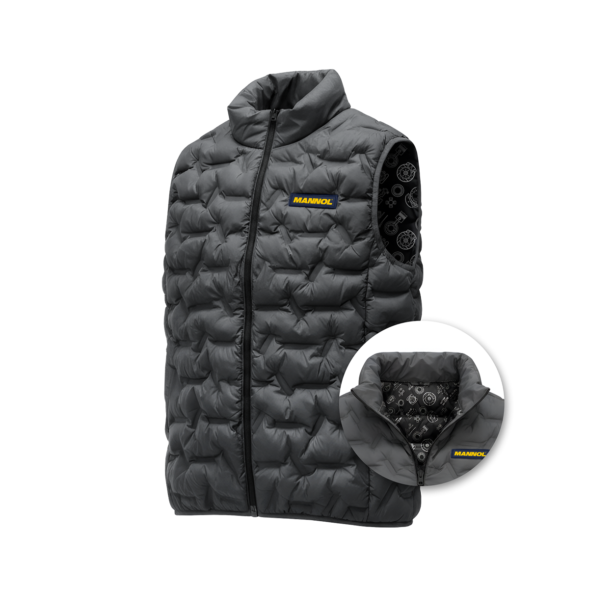 Quilted vest with 100% polyester shell and graphene print lining.