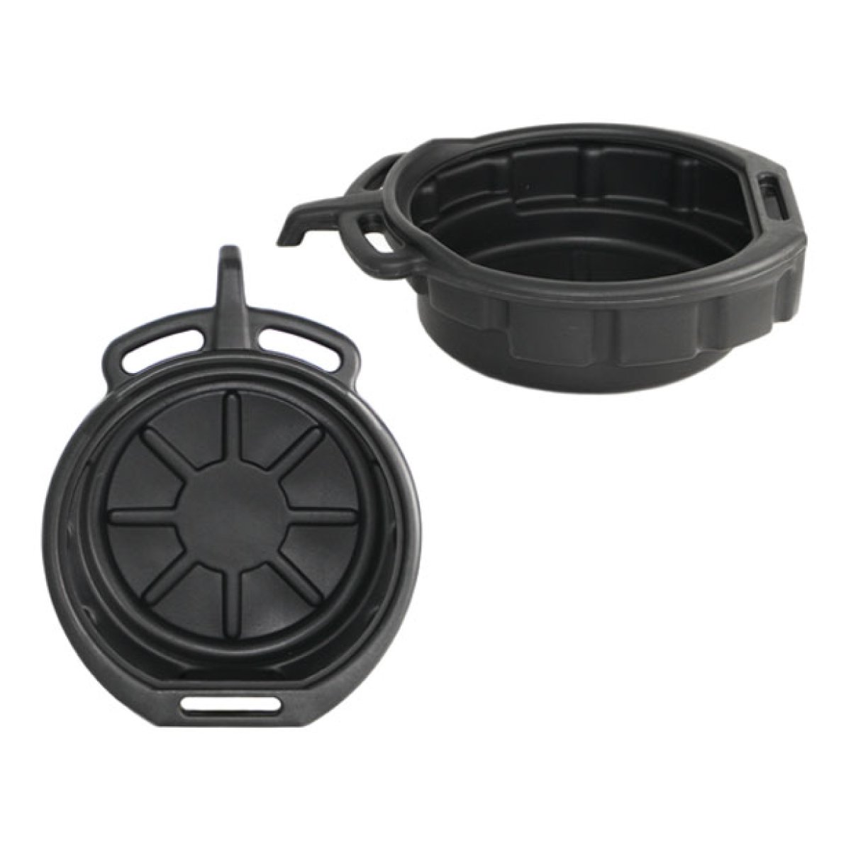 Oil collector for collecting waste oil of vehicles with an integrated funnel and practical large handles. Ideal for easier and cleaner oil changes.