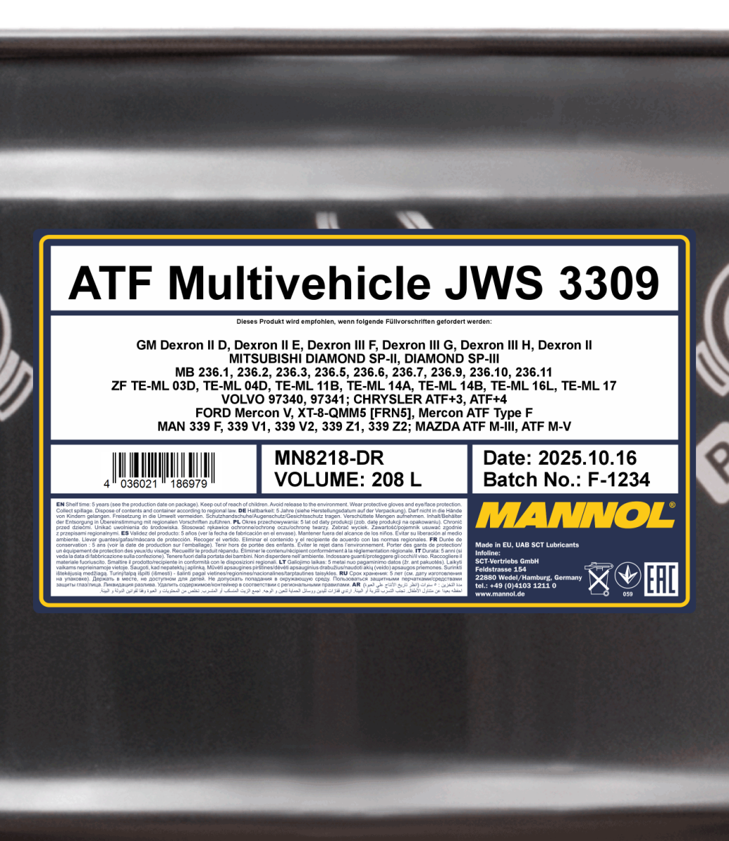 A universal all-season high-viscosity synthetic transmission fluid (ATF) for automatic gearboxes. It was specially developed for all modern automatic gearboxes (manual or sequential modes, electronic control, etc.) equipped with and without a hydraulic converter lock-up. It is also compatible with old-generation automatic gearboxes, hydraulic power steering systems, ship reversing gears, hydrostatic transmissions, hydraulic/mechanical systems in which the use of fluids that correspond to Dexron (except Dexron VI) or Mercon standards is prescribed.