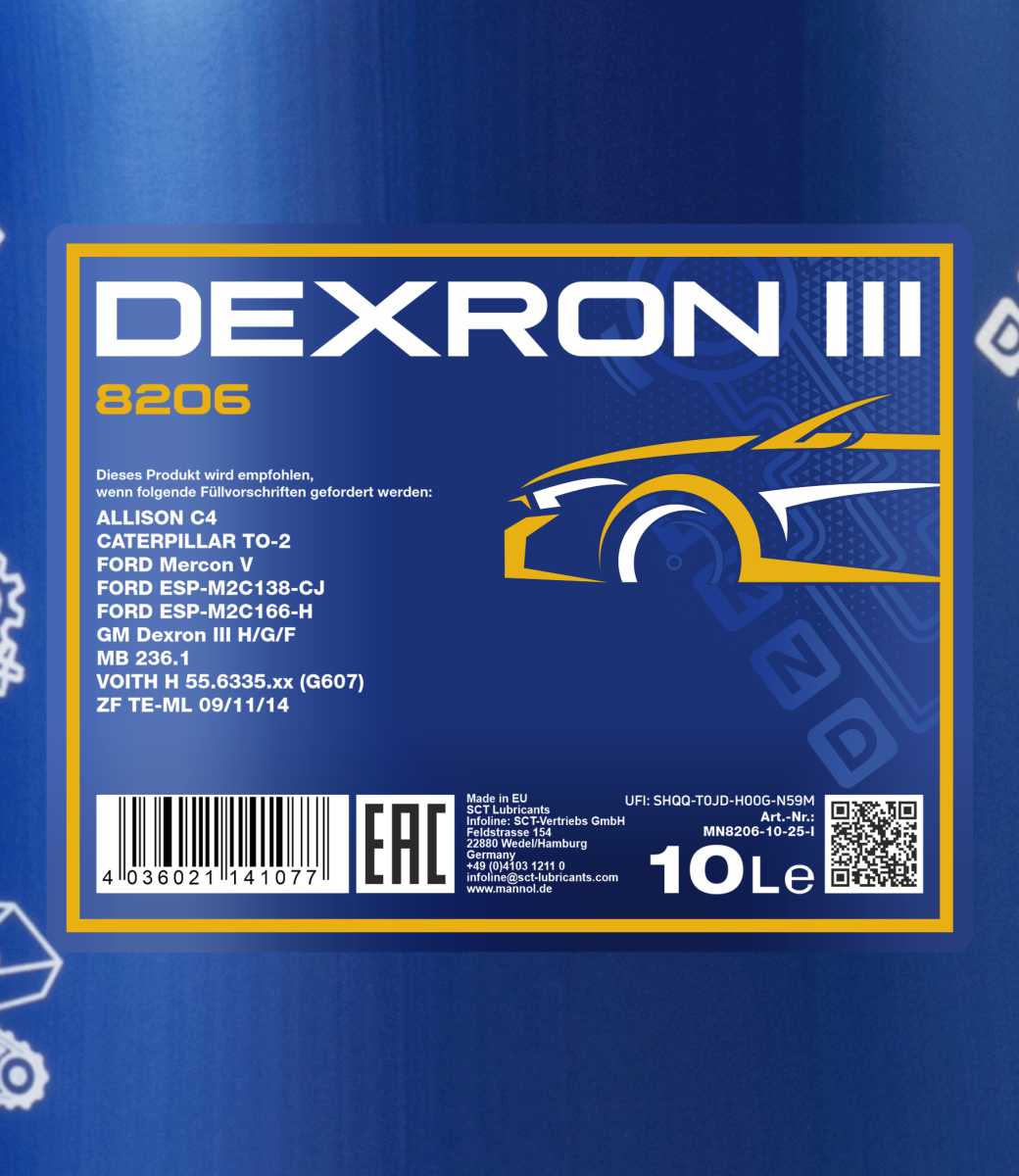 It is recommended for automatic gearboxes of passenger cars and commercial vehicles requiring the ATF Type Dexron-III H/G/F or Dexron-II E or FORD MERCON V quality oil. It is designed for the majority of automatic gearboxes for General Motors, Ford Company and other brands manufactured up to 2006.