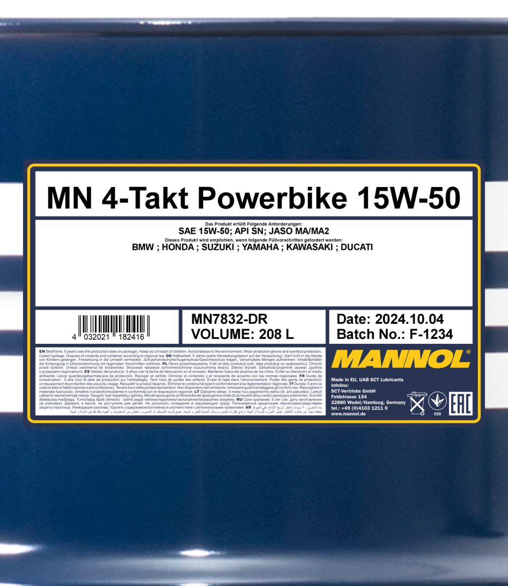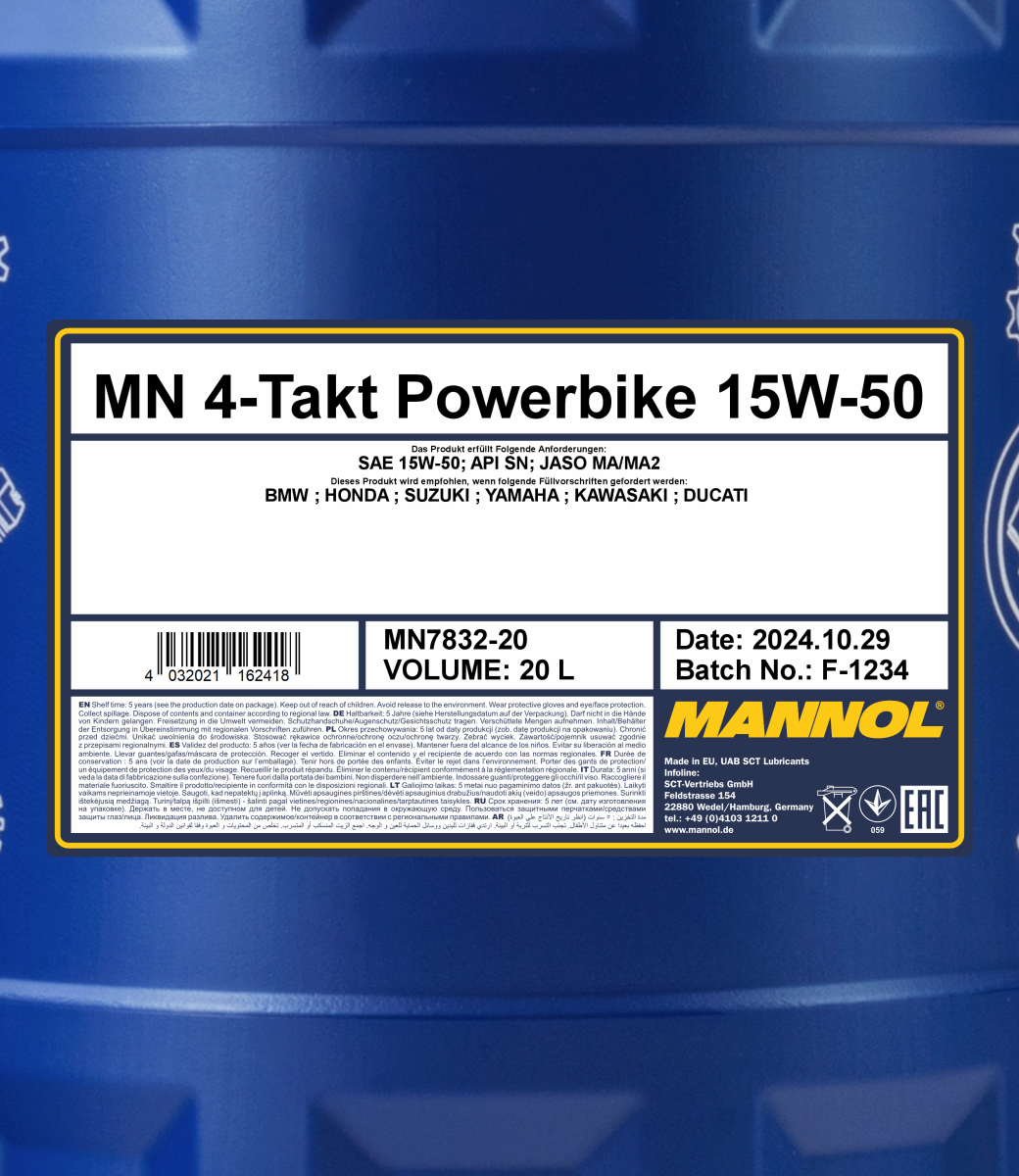 It is designed for petrol-powered 4-stroke engines of motorcycles of all types, all-terrain vehicles (quadricycles), scooters and motor scooters with air and liquid cooling with or without an integrated gearbox, oil bath clutch coupling and “dry” clutch and other two-wheeled vehicles with and without catalytic converters that are in compliance with Euro I, II, III requirements when the required operating properties are of API SN or lower and JASO MA/MA2 level. It is ideal for injection engines. It is recommended for particular DUCATI engines that require oil with the viscosity class 15W-50.