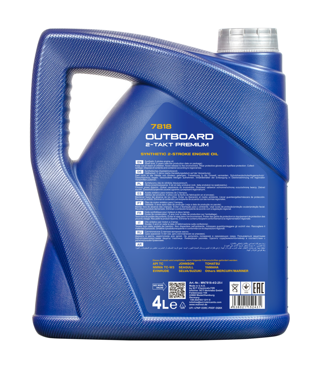 A high-quality synthetic-based engine oil for modern 2-stroke outboard engines with water cooling and various fuel and oil mixing (input) systems. Is was designed in compliance with heightened requirements for last-generation outboard engines with a direct injection, but may also be used in carburettor engines.
