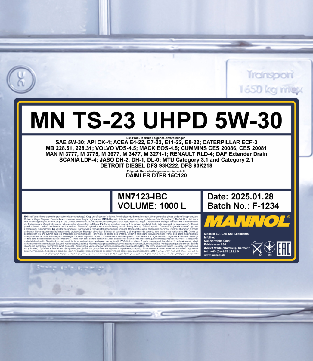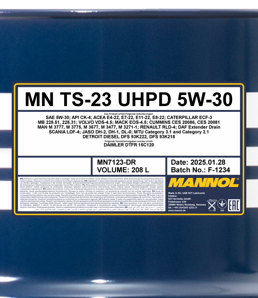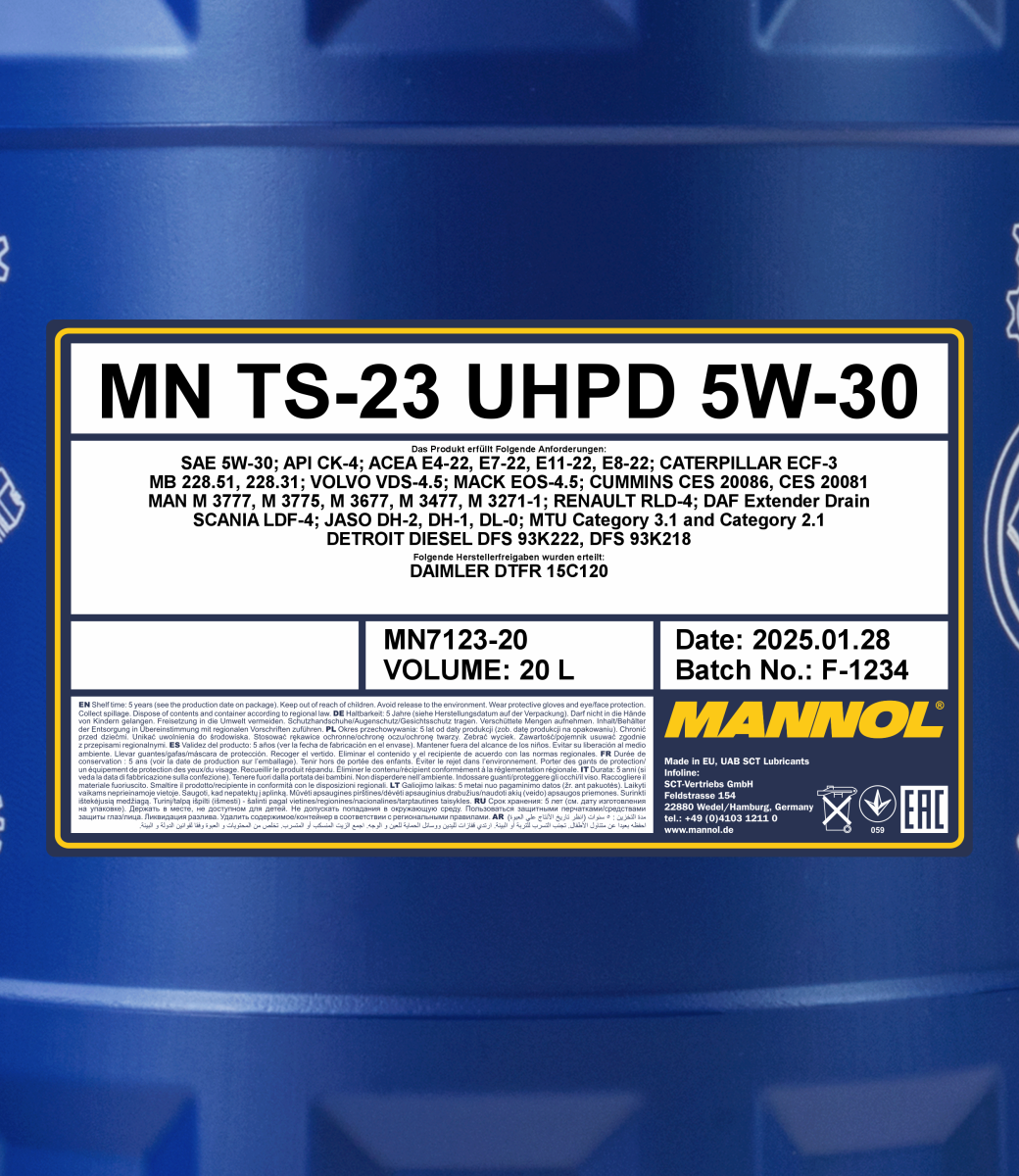 - The synthetic base, special TBN-boosters and antioxidants give the oil maximum thermal oxidation stability, excellent detergent-dispersing properties (TBN>12) and at the same time low ash content, which effectively reduces soot and varnish formation, prevents the formation of deposits of all kinds and keeps engine separate parts, especially the cylinder-piston group, perfectly clean throughout the entire interval between oil changes;