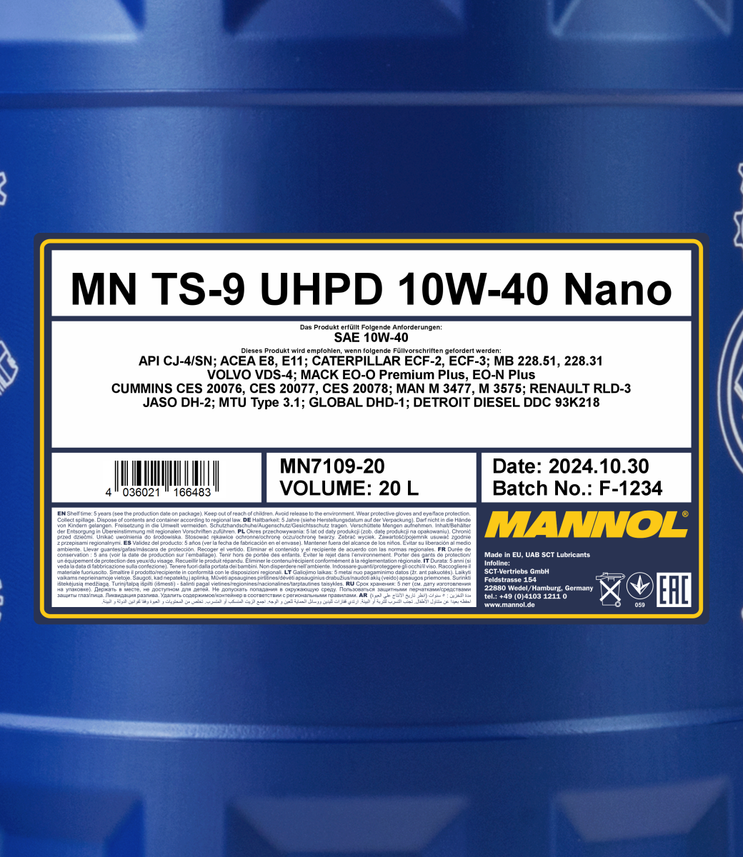 All-season synthetic low-ash engine oil for the latest generation of highly loaded and high-speed turbocharged and non-turbocharged heavy-duty diesel engines using low-sulphur fuels. The oil complies with the GLOBAL-DHD-1 specification, which takes into account all requirements of European, American and Japanese manufacturers of heavy-duty diesel engines produced since 1998, operating under heavy conditions with extended oil change intervals, meeting applicable standards regarding the content of toxic substances in exhaust gases and installed in heavy-duty vehicles (over 3.9 tons).