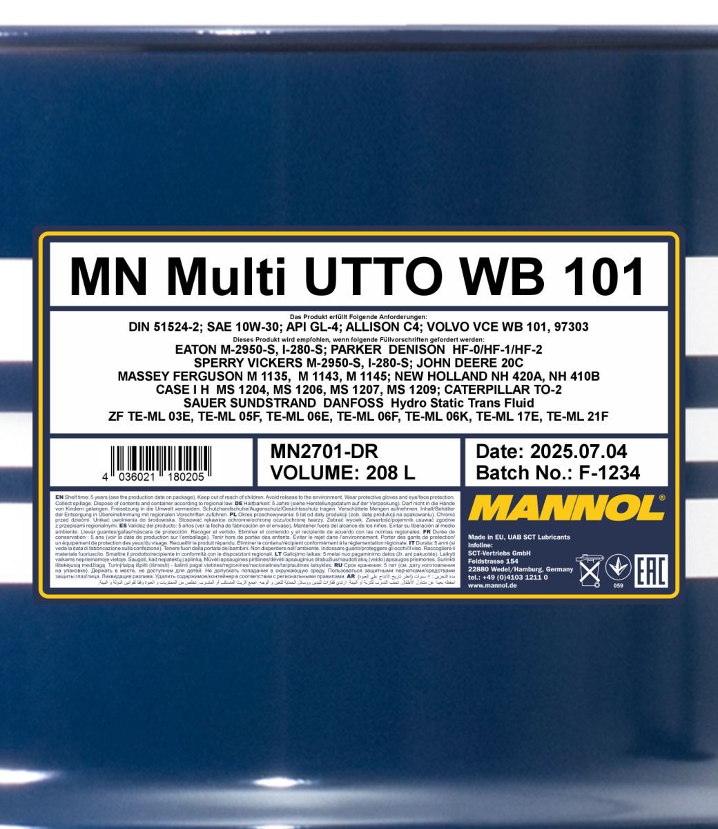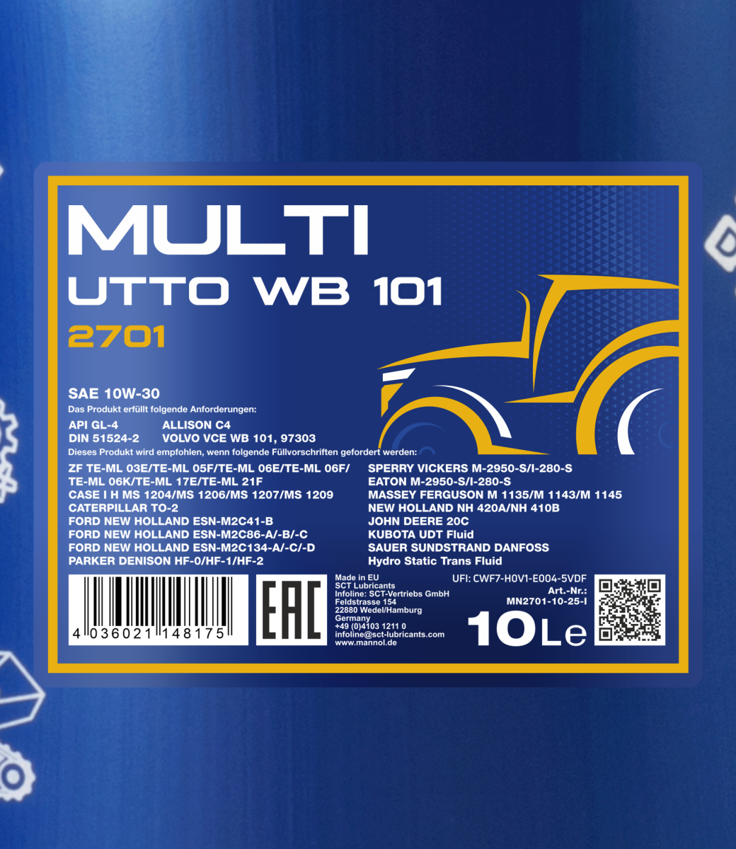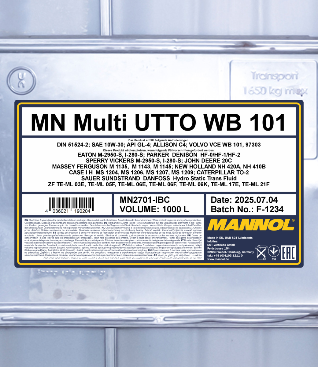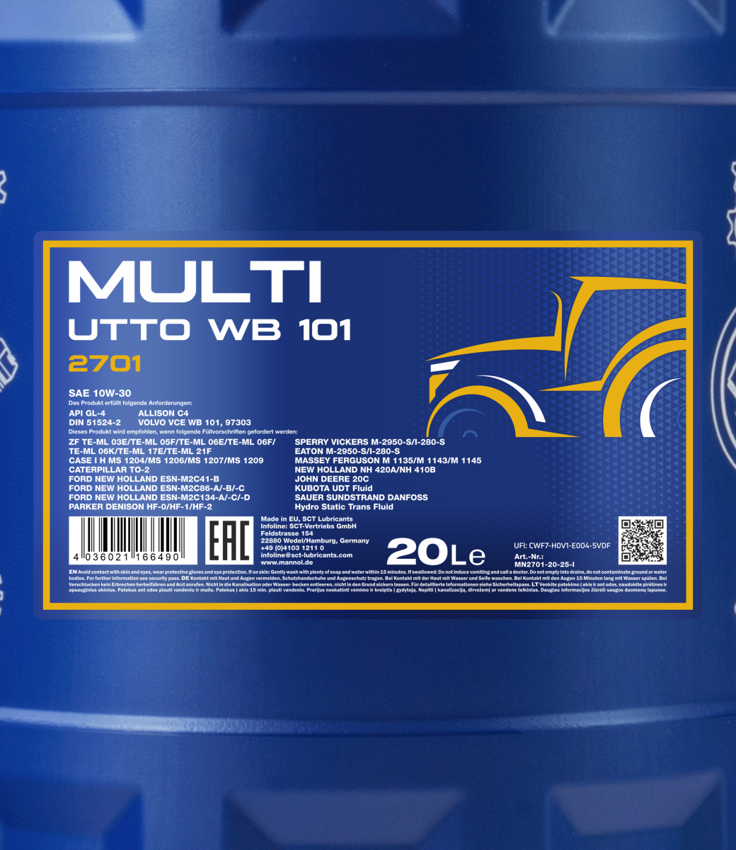 A universal and multi-functional mineral all-season tractor oil for farm holdings and tractors, agricultural vehicles with very high operating characteristics. Its main purpose: an oil for on-board gearboxes with a standard replacement interval. It complies with Volvo 97303 requirements. It is also suitable for mechanical gearboxes with and without synchronizers, transmissions (including power transmissions), back axles, hydraulic systems (including the ones integrated with a mechanical gearbox) and other equipment that requires Universal Tractor Transmission Oil (UTTO) grade oil. It is particularly suitable for the reduction of vibration in “wet†brake systems and power-take off.