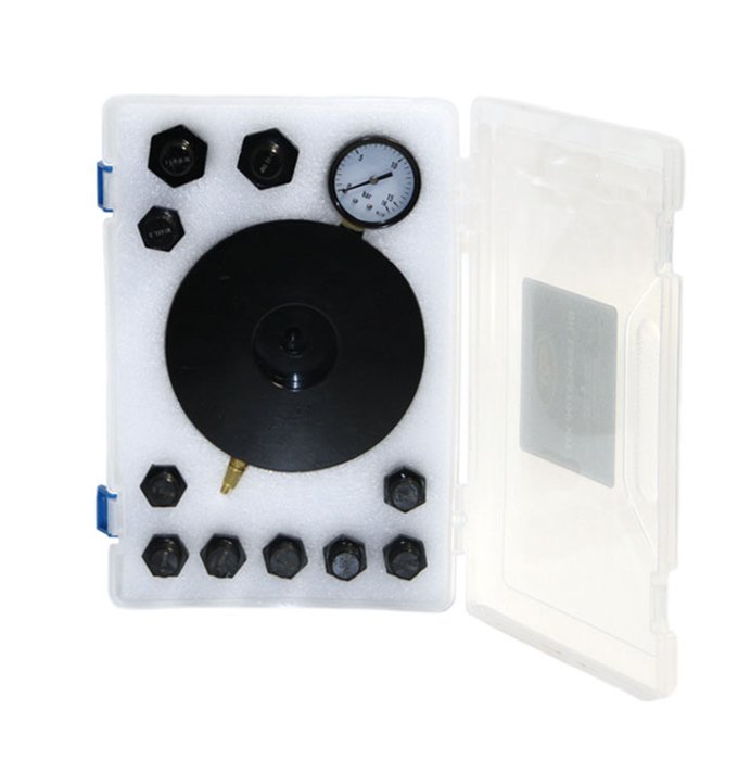Tool for leak testing/inspection of auto oil filters. Adapter measurements: 1-12UNF; 3/4-16UNF; 11/8-16UNF; 13/16-16UNF M12x1.5; M16x1.5; M18X1.5; M30x1.5; M22x1.5