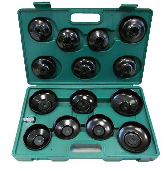 Oil Filter Wrench Set (15 pcs). HC - 74/76 mm - 15 flutes - 2 step HC - 74/76 mm - 14 flutes - 2 step HC - 93 mm - 15 flutes - 1 step HC - 65/67 mm - 14 flutes - 2 step HC - 73 mm - 14 flutes - 1 step HC - 80 mm - 15 flutes - 1 step HC - 68 mm - 14 flutes - 1 step HC - 93 mm - 36 flutes - 1 step HC - 90 mm - 15 flutes - 1 step HC - 75/77 mm - 15 flutes - 2 step HC - 80 mm - 15 flutes - 1 step HC - 65 mm - 14 flutes - 1 step HC - 76 mm - 30 flutes - 1 step HC - 100 mm - 15 flutes - 1 step Adapter - 1/2” dr. (F) x 3/8” (M).